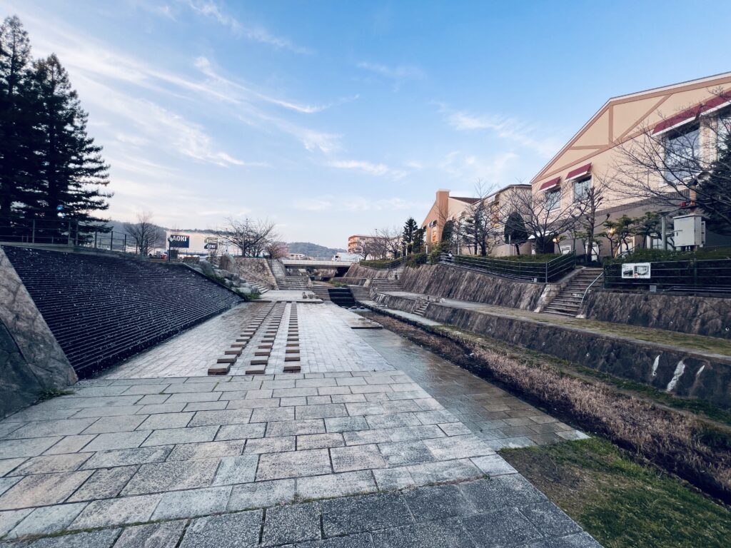 ショッピングモールに人工の川が流れているというのは、たまに見るのだけれど、自然の川を挟んでショッピングモールがあるというのは、珍しいと思う。