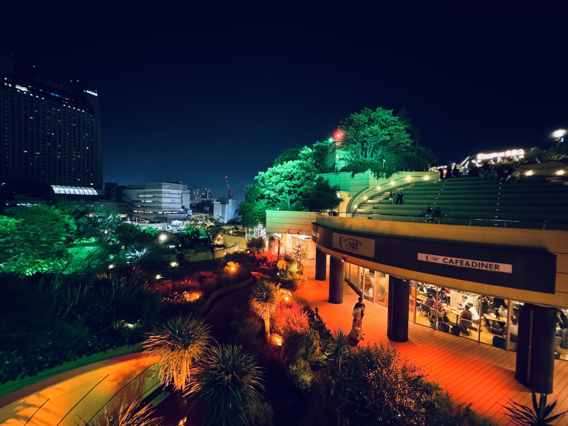 昼間は太陽の光を浴びながら、ぼんやりと雲を眺める。夜になると、ライトアップされた空間の中で、遠くのビルの明かりがキラキラと光る。近くのビアガーデンから聞こえてくる音楽が、ちょうどいいBGMになって、ここが都会のど真ん中であることを思い出させてくれます。